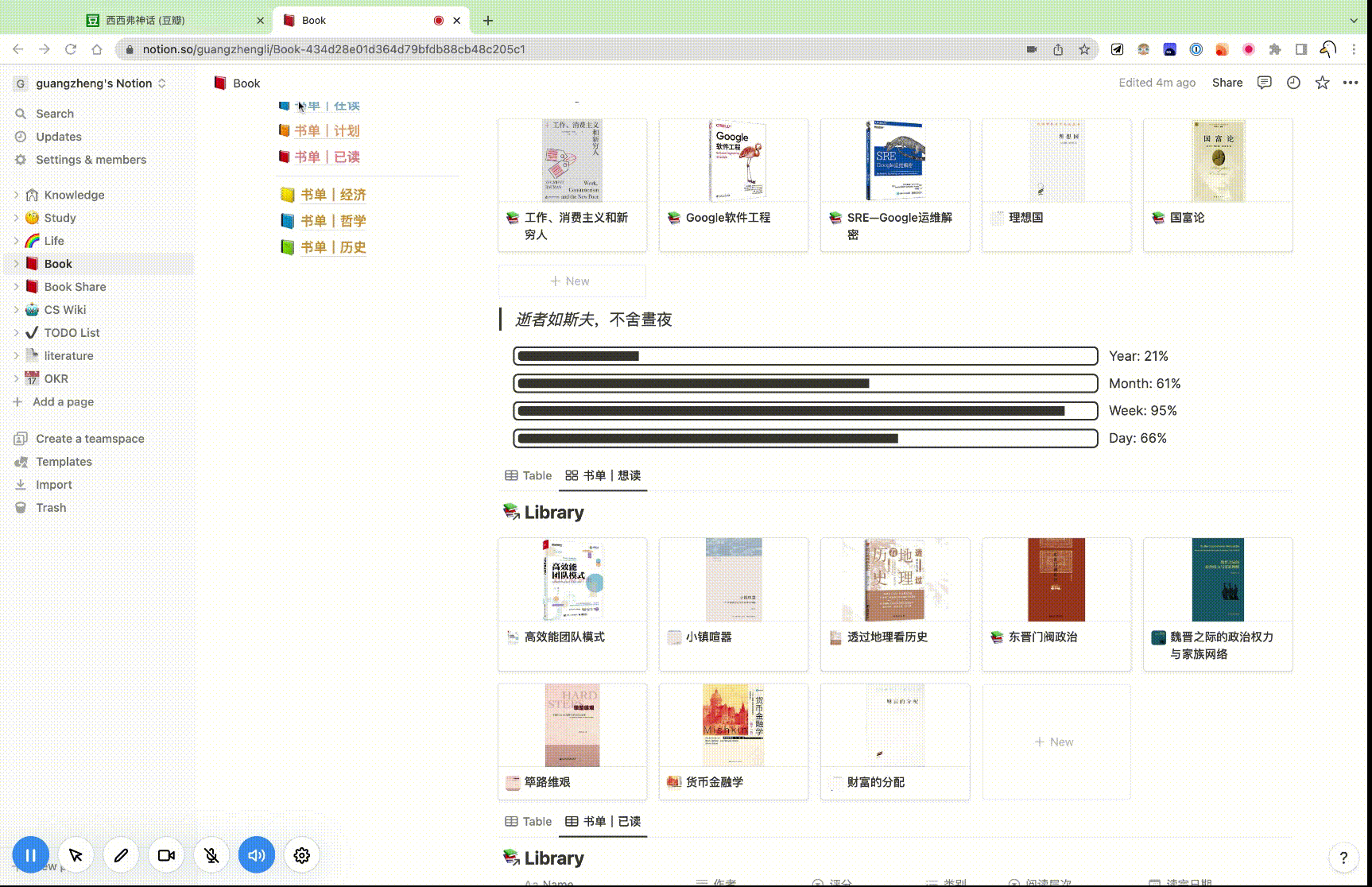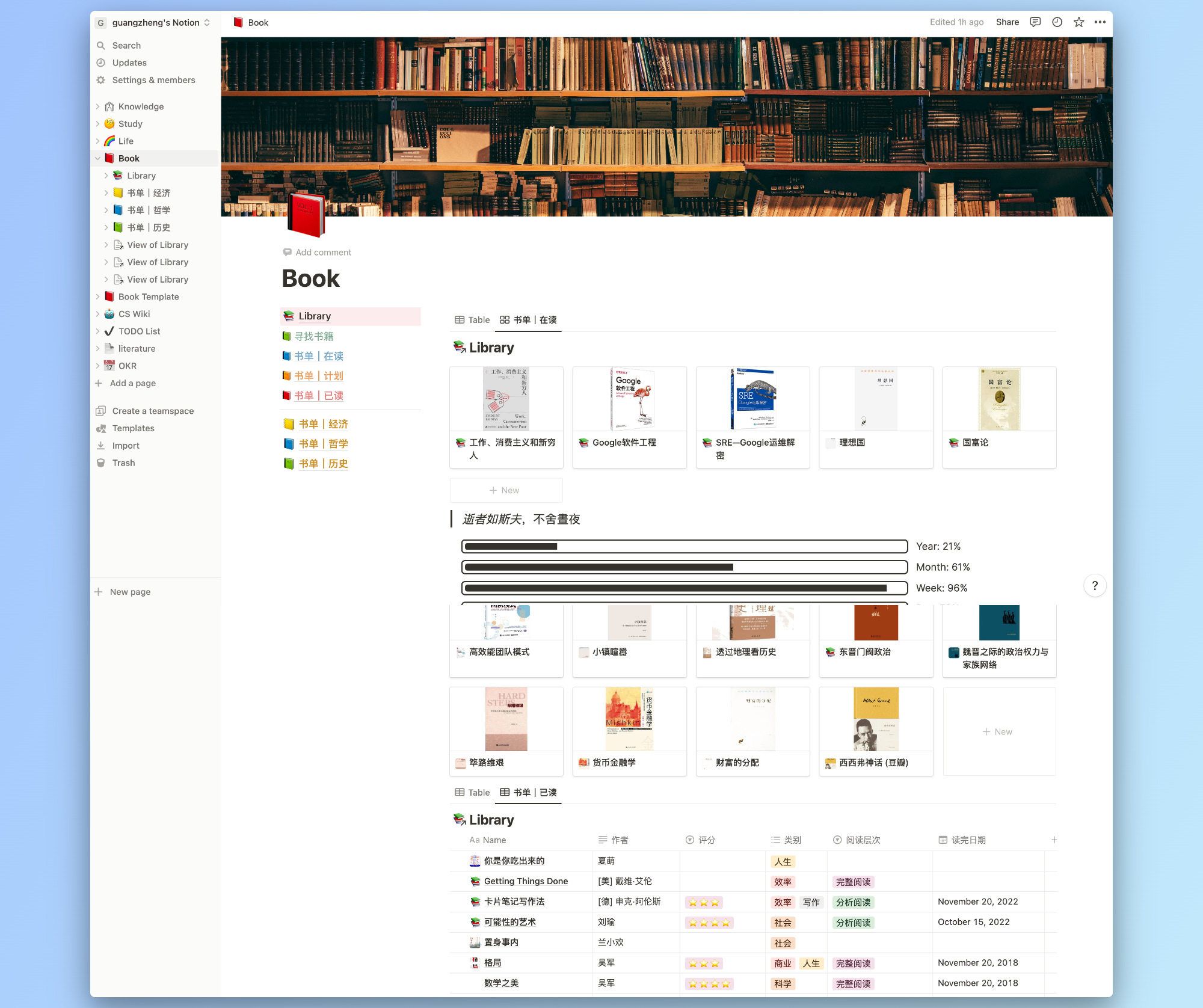 其次可以通过该数据库组织视图,将在读书单、想读书单、已读书单和计划书单列在入口处,这样一个基本的图书馆系统就组织成功了。如果你也想要类似的效果,你可以通过点击 Guangzheng Book Template 来复制模版创建一个属于你的数据库和书籍管理系统。
