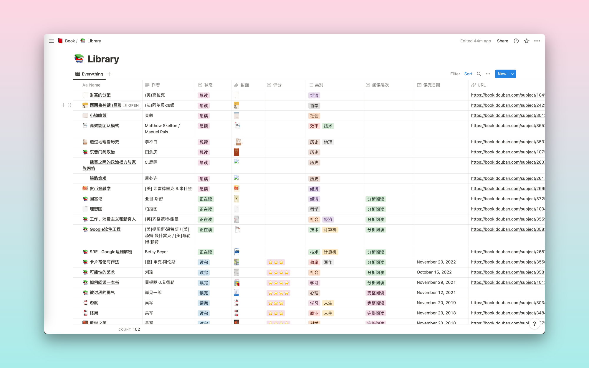 首先在 notion 中定制一个图书资源的数据库,定制相关的数据库字段。诸如书籍名称、作者、读书状态、封面图片、类别等等。