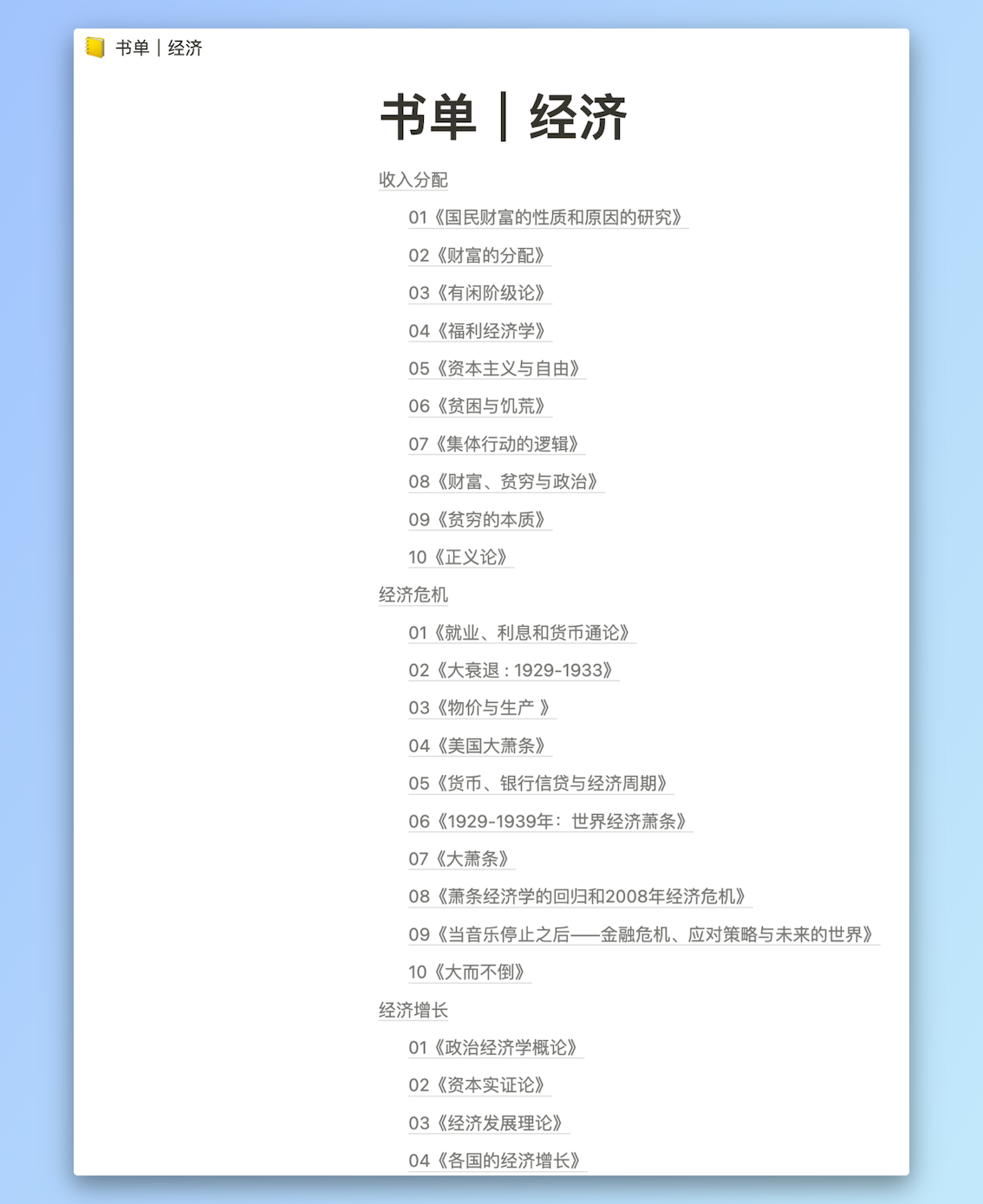 对于书籍来说,你可以在 notion 中创建一个新的 Page 来存放书单,例如下面的经济学书单,你同样可以在 Guangzheng Book Template 中找到这个页面: