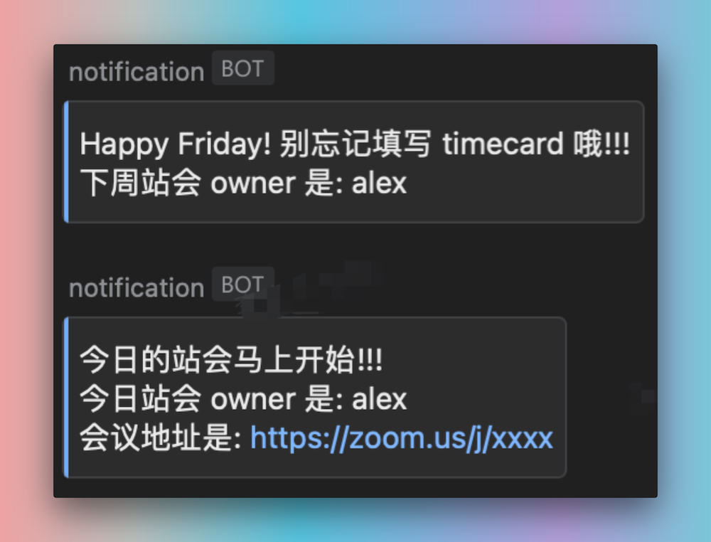 var message = `今日的站会马上开始!!!\n今日站会 owner 是: ${standup_owner_name}\n会议地址是: https://zoom.us/j/xxxx`;